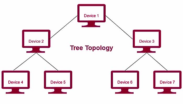 The tree will be having different branches associated with it similarly, the tree topology is having hubs within it. These hubs are connected serially. When we observe this serial mannered connection, we get an idea of bus topology, and when we observe the nodes which are connected to hubs we sense the star topology.